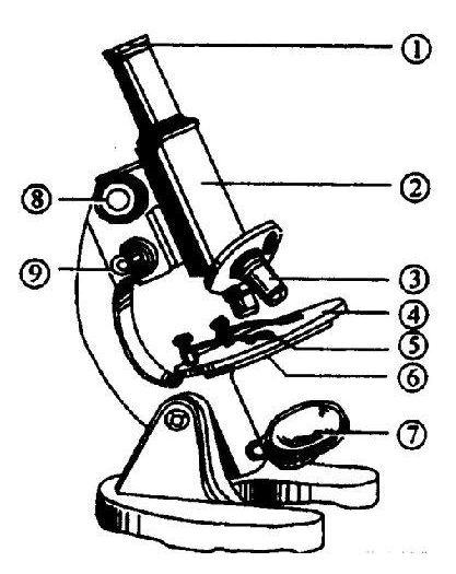 (1)可调节镜筒高低的有[8]粗准焦螺旋、[9]细准焦螺旋。